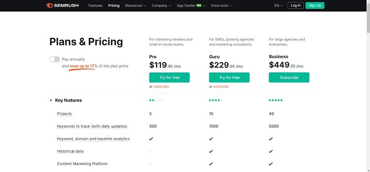 SEMRush offers subscription plans to meet everyone’s requirements, be it marketing newbies, SMEs, marketing consultants, or large agencies and enterprises. You may opt to pay for the following plans monthly or annually and save up to 17% of the price plan.